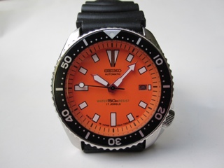 Seiko DIVER ini saya hadirkan dgn sedikit merubah tampilan dari aslinya,dengan Dial warna orange aftermarket beserta innernya..insert yg seharusnya warna Pepsi diganti dengan warna hitam aftermarket agar tampil serasi... Rubber strap aftermarket.. mesin masih dipertahankan dgn cal 7002 yg dibuat di Singapura.bezel berputar kiri dan kanan,crown mengunci rapat,dan mesin masih berjalan normal,body sudah dipoles,agar kelihatan cling,
